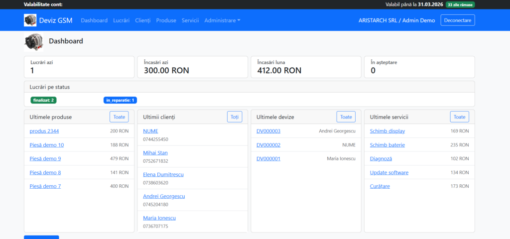 Gestionează fișe de service, devize, piese, clienți și facturare într-o singură platformă online.